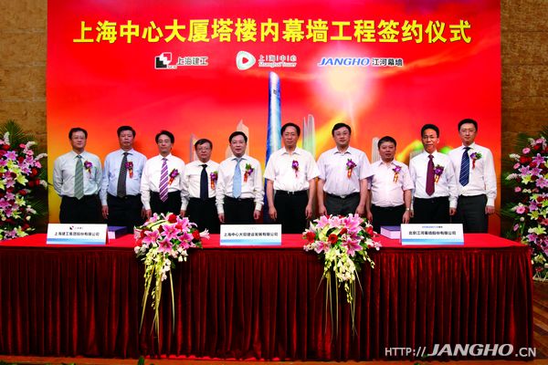 中共順義區委書記張延昆,順義區委副書記、區長王剛,順義區委常委、副區長林向陽,上海城投總公司總經理、上海中心大廈建設發展有限公司董事長孔慶偉,上海中心大廈建設發展有限公司董事、總經理顧建平,上海建工集團股份有限公司副總裁、上海中心大廈項目部總經理房慶強,上海中心大廈建設發展有限公司副總經理高超、上海建工集團股份有限公司副總經濟師、上海中心大廈項目部總經濟師忻金兒等領導蒞臨出席簽字儀式,見證了這一莊重而又喜慶的時刻。江河幕墻副總裁周韓平主持儀式。